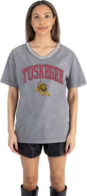Tuskegee University Women's Garment-Washed Relaxed Fit Tee with Jeweled Rhinestone V-Neck